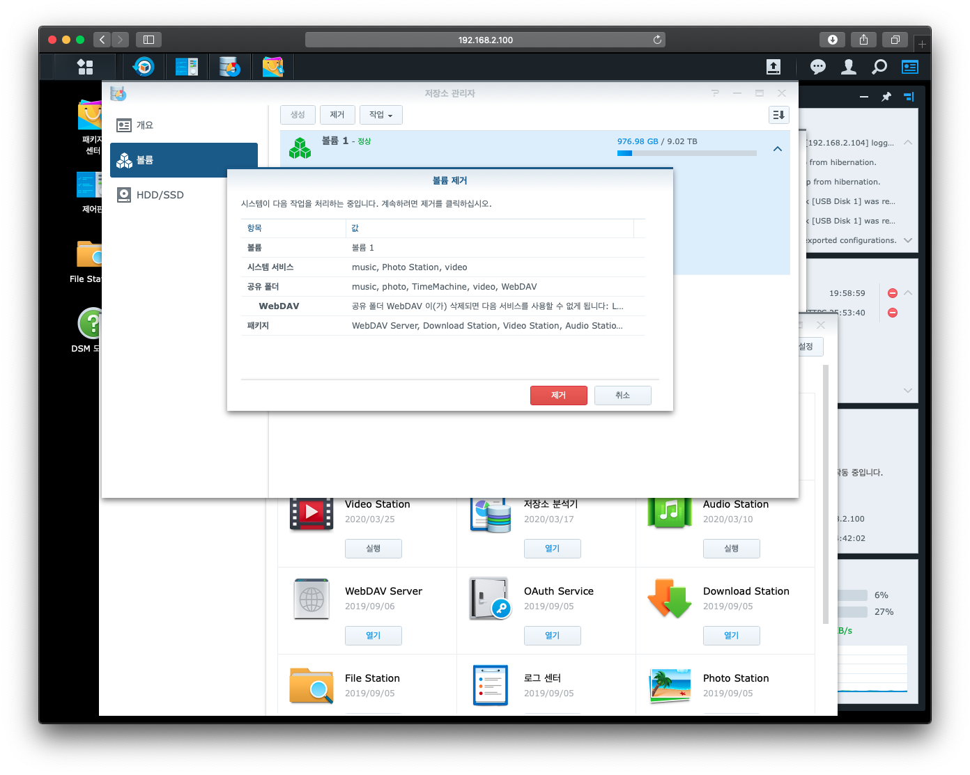 3. 저장소 관리자에서 볼륨 탭에 들어가 제거를 한다.